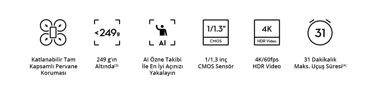 Ayrıca, AI Konu Takibi[2] özelliği, ana konunun mükemmel bir şekilde kadrajda kalmasını sağlar, böylece etkileyici çekimler yapmak son derece kolay hale gelir. Katlanabilir Tam Kapsamlı Pervane Korumasının yenilikçi tasarımı, hafif yapıyı optimum güvenlikle kusursuz bir şekilde birleştirir. İster uzak manzaraları ister yakın çekim portreleri yakalıyor olun, DJI Flip her kareye görsel bir güzellik katar.